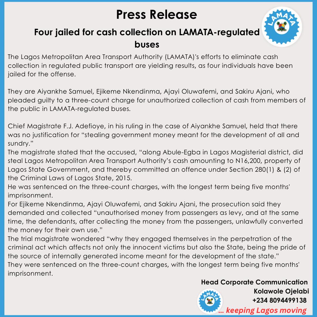 The Lagos Metropolitan Area Transport Authority (LAMATA)’s efforts to eliminate cash collection in regulated public transport are yielding results, as four individuals have been jailed for the offense.